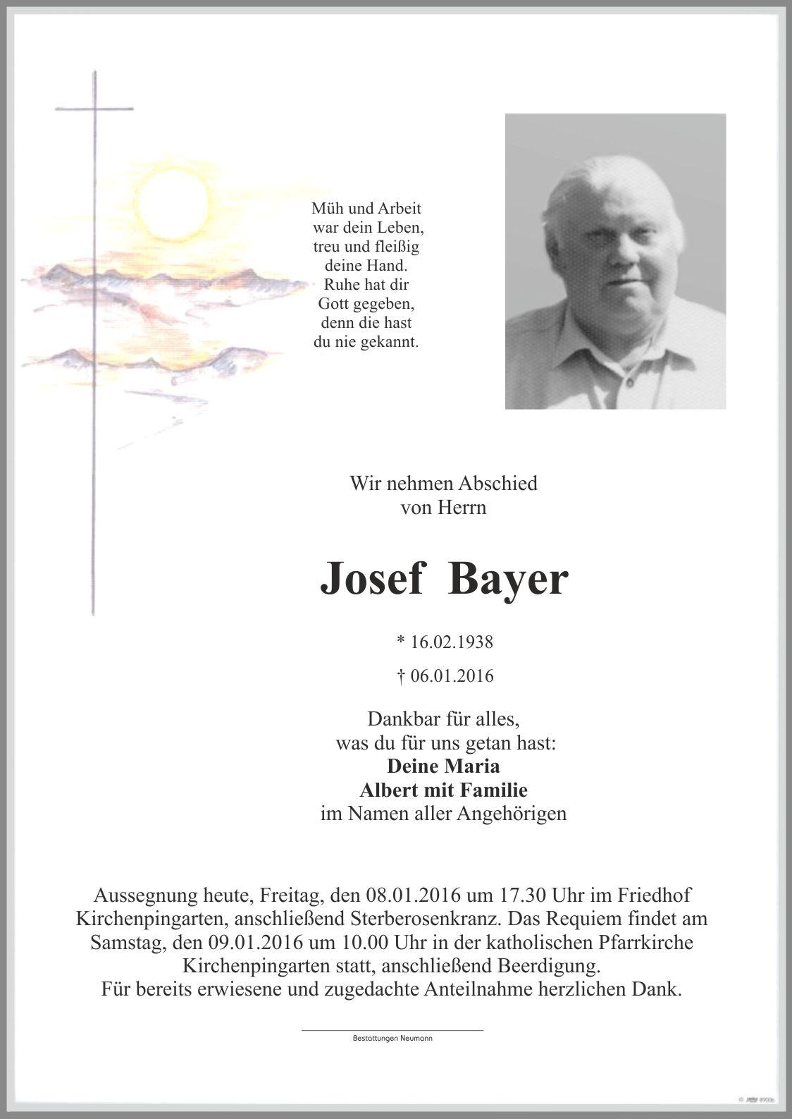 Das Requiem findet am Samstag, den 09.01.2016 um 10.00 Uhr in der katholischen Pfarrkirche Kirchenpingarten statt, anschließend Beerdigung. Für bereits erwiesene und zugedachte Anteilnahme herzlichen Dank.