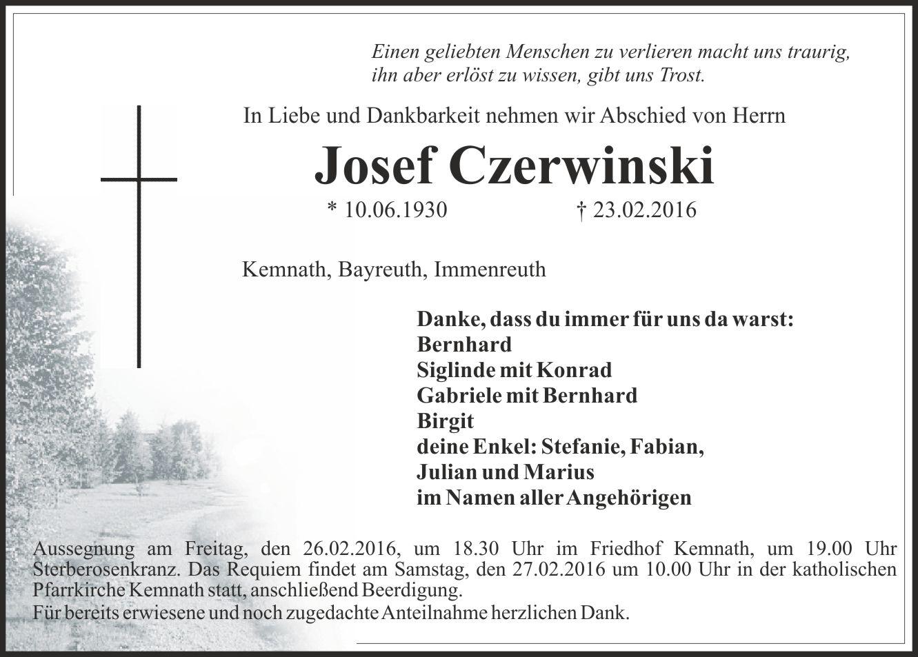 Requiem am Samstag, den 27.02.2016, um 10.00 Uhr in der katholischen Pfarrkirche Kemnath, anschließend Beerdigung im Friedhof Kemnath. Für alle Anteilnahme herzlichen Dank.