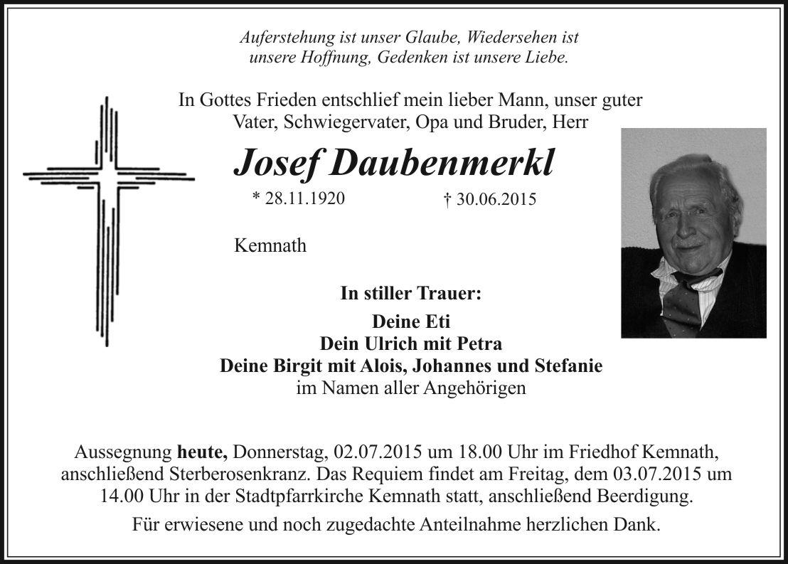 Aussegnung am Donnerstag, dem 02.07.2015 um 18.00 Uhr im Friedhof Kemnath,