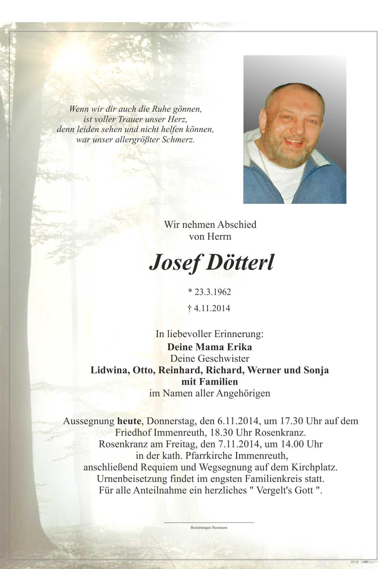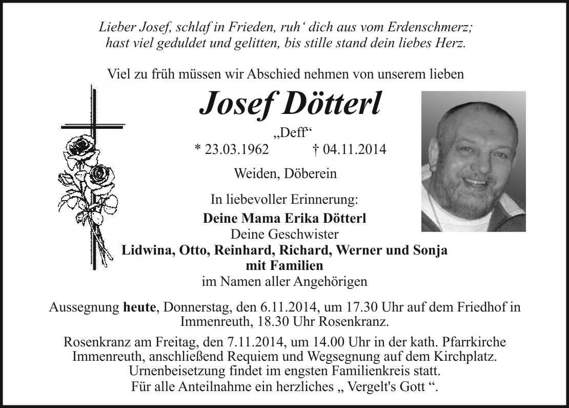 Rosenkranz am Freitag, den 7.11.2014, um 14.00 Uhr in der kath. Pfarrkirche Immenreuth, anschließend Requiem und Wegsegnung auf dem Kirchplatz. Urnenbeisetzung findet im engsten Familienkreis statt.