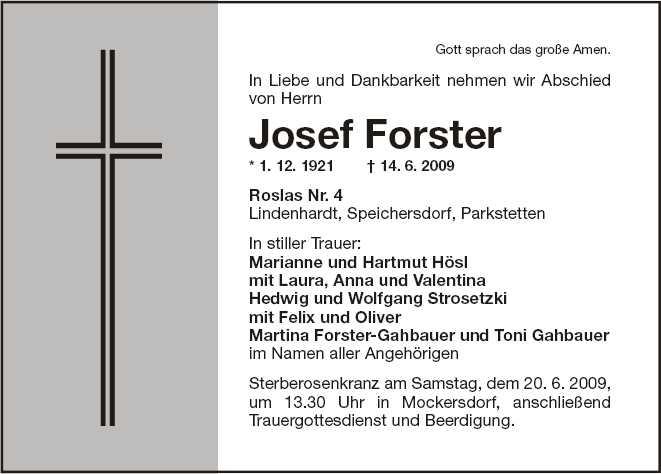 Die Beisetzung findet am Samstag, 20.06.2009 um 14:30 Uhr auf dem Friedhof in Mockersdorf statt.