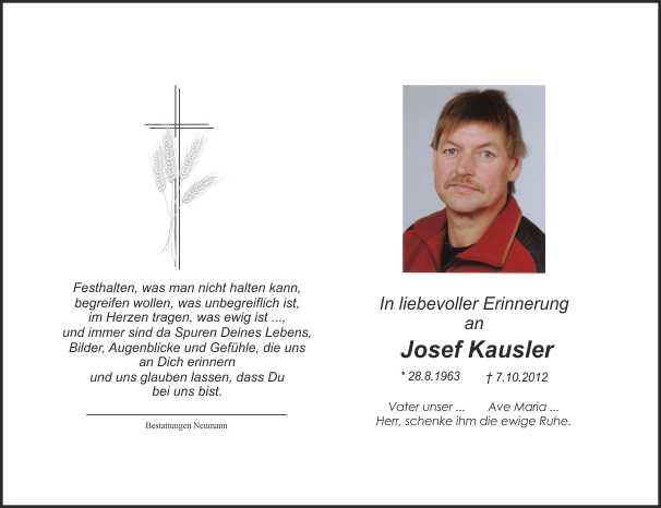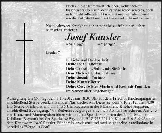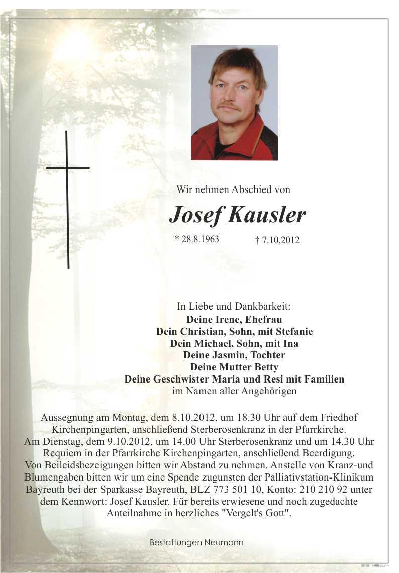 Aussegnung am Montag, dem 8.10.2012, um 18.30 Uhr auf dem Friedhof Kirchenpingarten, anschließend Sterberosenkranz in der Pfarrkirche. Am Dienstag, dem 9.10.2012, um 14.00 Uhr Sterberosenkranz und um 14.30 Uhr Requiem in der Pfarrkirche Kirchenpingarten, anschließend Beerdigung. Von Beileidsbezeigungen bitten wir Abstand zu nehmen. Anstelle von Kranz-und Blumengaben bitten wir um eine Spende zugunsten der Palliativstation-Klinikum Bayreuth bei der Sparkasse Bayreuth, BLZ 773 501 10, Konto: 210 210 92 unter dem Kennwort: Josef Kausler. Für bereits erwiesene und noch zugedachte Anteilnahme in herzliches "Vergelt's Gott".