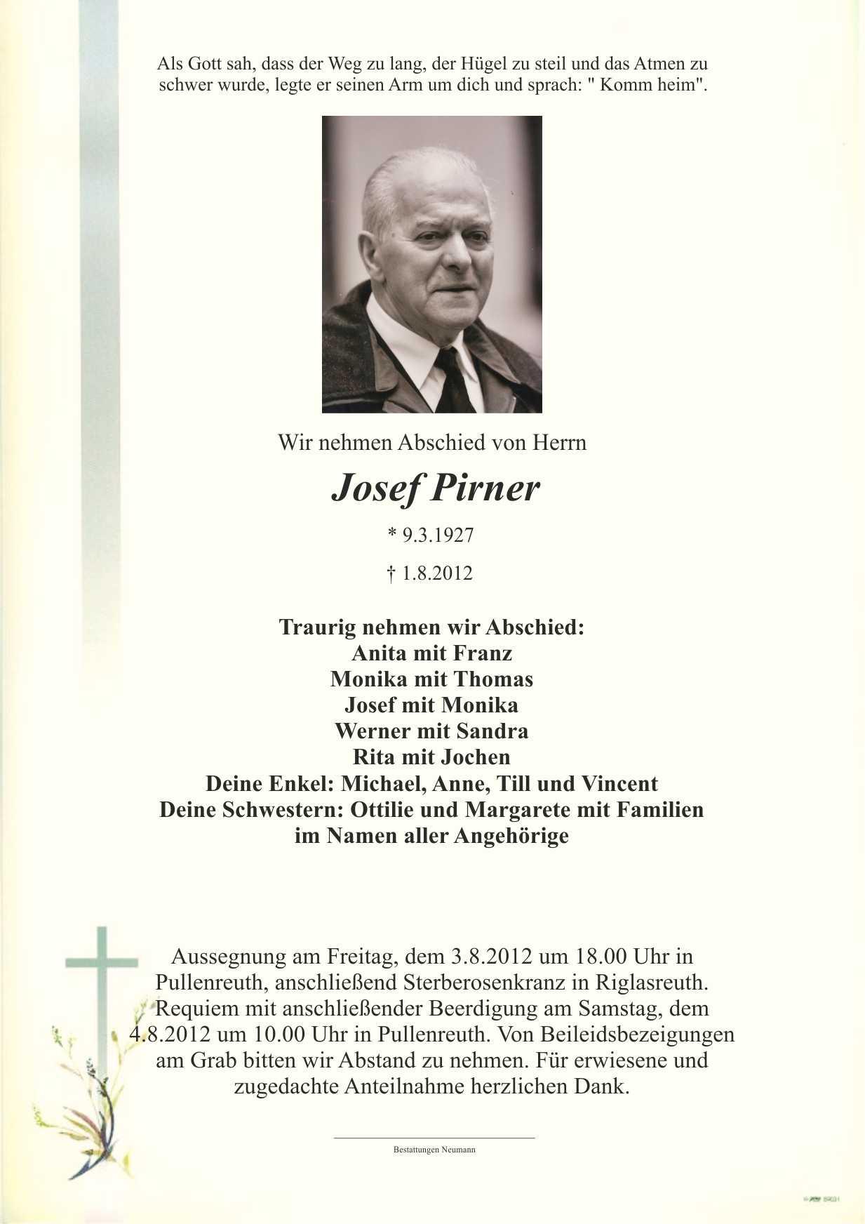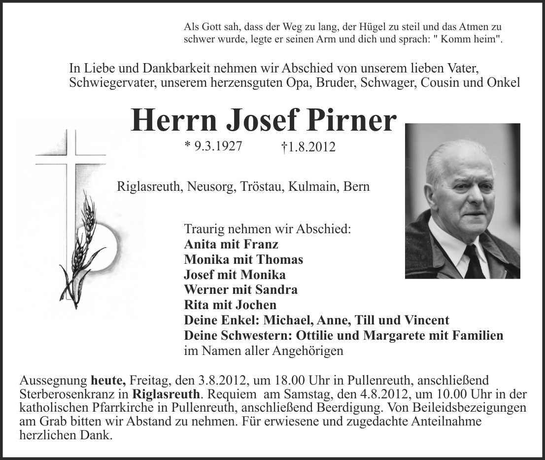 Aussegnung, heute, Freitag, den 3.8.2012, um 18.00 Uhr in Pullenreuth, anschließend Sterberosenkranz in Riglasreuth. Requiem am Samtag, dem 4.8.2012, um 10.00 Uhr in der katholischen Pfarrkirche in Pullenreuth, anschließend Beerdigung. Von Beileidsbezeigungen am Grab bitten wir Abstand zu nehmen. Für erwiesene und zugedachte Anteilnahme herzlichen Dank.