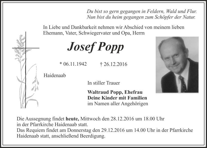 Das Requiem findet am Donnerstag den 29.12.2016 um 14.00 Uhr in der Pfarrkirche Haidenaab statt, anschließend Beerdigung.