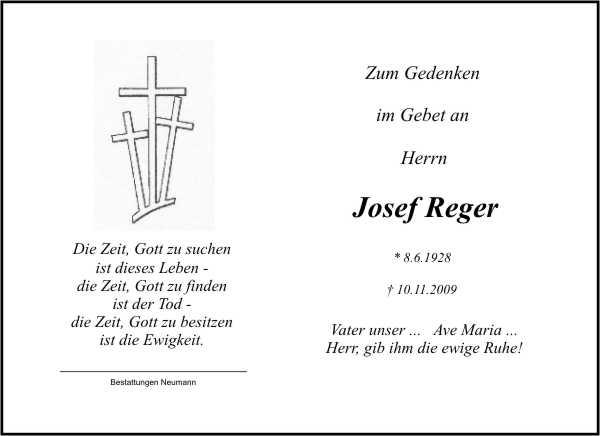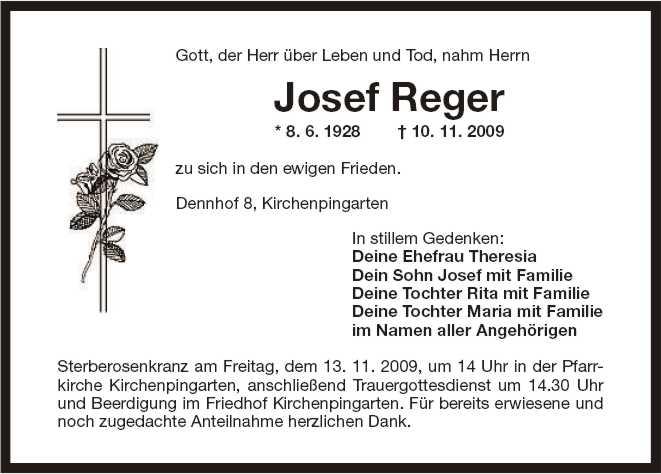 Der Trauergottesdienst findet am Freitag dem 13.11.2009 um 14.30 Uhr in der katholischen Pfarrkirche in Kirchenpingarten statt, anschließend Beerdigung.