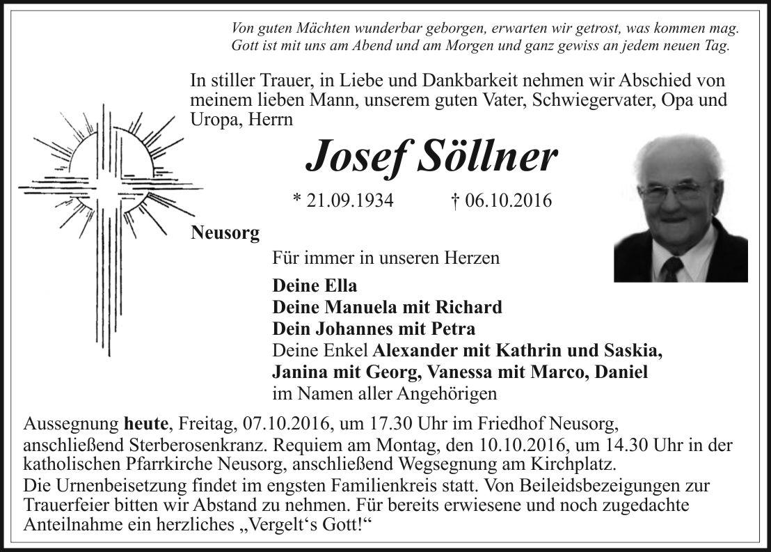 anschließend Sterberosenkranz. Requiem am Montag, den 10.10.2016, um 14.30 Uhr in der katholischen Pfarrkirche Neusorg, anschließend Wegsegnung am Kirchplatz.