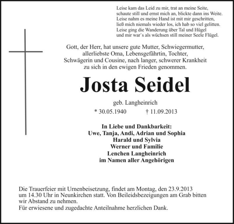 Die Trauerfeier mit Urnenbeisetzung, findet am Montag, den 23.9.2013 um 14.30 Uhr in Neunkirchen statt. Von Beileidsbezeigungen am Grab bitten wir Abstand zu nehmen.