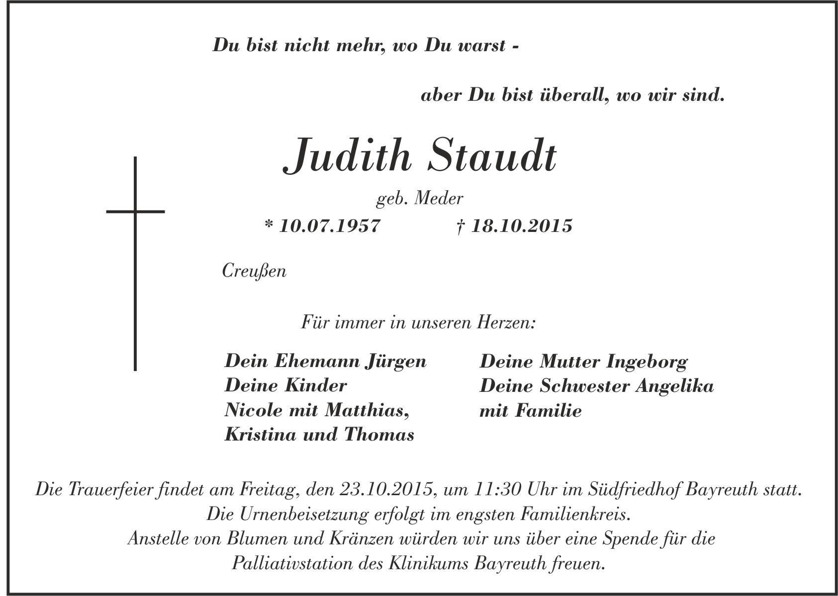 Die Trauerfeier findet am Freitag, den 23.10.2015, um 11:30 Uhr im Südfriedhof Bayreuth statt. Die Urnenbeisetzung erfolgt im engsten Familienkreis. Anstelle von Blumen und Kränzen würden wir uns über eine Spende für die Palliativstation des Klinikum Bayreuths freuen.