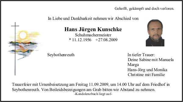 Trauerfeier mit anschließender Urnenbeisetzung am Freitag, dem 11.9.2009 um 14.00 Uhr auf dem Friedhof in Seybothenreuth.