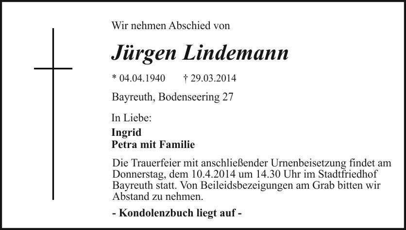 Die Trauerfeier mit anschließender Urnenbeisetzung findet am Donnerstag, dem 10.4.2014 um 14.30 Uhr im Stadtfriedhof Bayreuth statt. Von Beileidsbezeigungen am Grab bitten wir Abstand zu nehmen. Kondolenzbuch liegt auf.