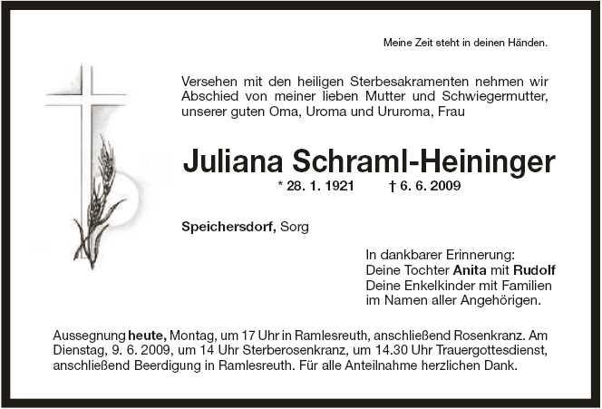 Beerdigung am Dienstag den 9.6.2009 um 14:30 auf dem Friedhof in Ramlesreuth