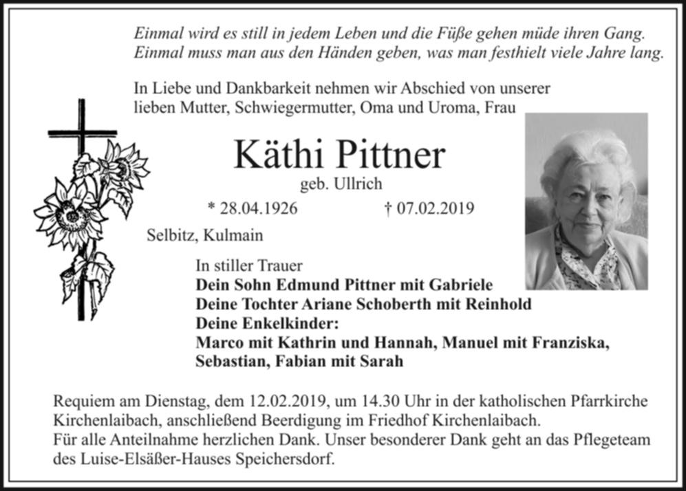 Requiem am Dienstag, dem 12.02.2019, um 14.30 Uhr in der katholischen Pfarrkirche Kirchenlaibach, anschließend Beerdigung im Friedhof Kirchenlaibach. Für alle Anteilnahme herzlichen Dank.