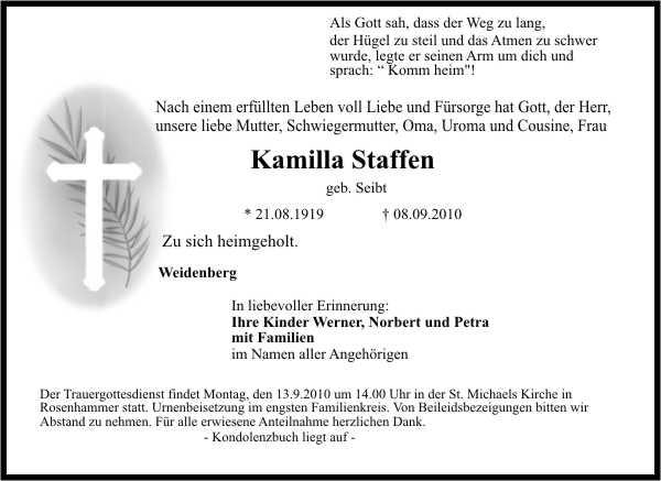 Die Beisetzung findet auf dem Friedhof in Friedhof in Weidenberg statt.