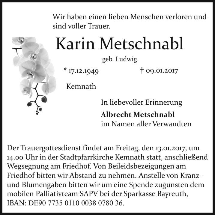 Der Trauergottesdienst findet am Freitag, den 13.01.2017, um 14.00 Uhr in der Stadtpfarrkirche Kemnath statt, anschließend Wegsegnung am Friedhof. Von Beileidsbezeigungen am Friedhof bitten wir Abstand zu nehmen. Anstelle von Kranz-und Blumengaben bitten wir um eine Spende zugunsten dem mobilen Palliativteam SAPV bei der Sparkasse Bayreuth,
