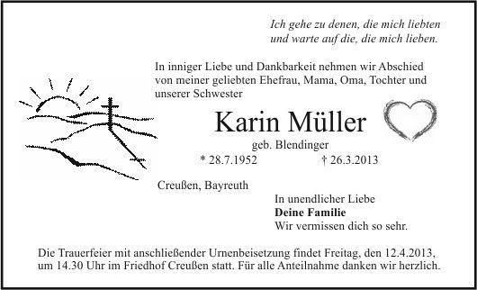 Die Trauerfeier mit anschließender Urnenbeisetzung findet Freitag, den 12.4.2013, um 14.30 Uhr im Friedhof Creußen statt. Für alle Anteilnahme danken wir herzlich.