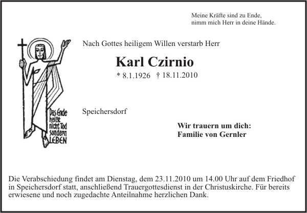 Die Verabschiedung findet am Dienstag, den 23.11.2010, um 14.00 Uhr auf dem Friedhof in Speichersdorf statt, anschließend Trauergottesdienst in der Christuskirche. Für bereits erwiesene und noch zugedachte Anteilnahme herzlichen Dank.
