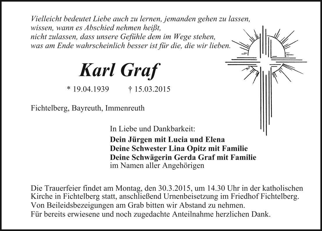 Die Trauerfeier findet am Montag, den 30.3.2015, um 14.30 Uhr in der katholischen Kirche in Fichtelberg statt, anschließend Urnenbeisetzung im Friedhof Fichtelberg.