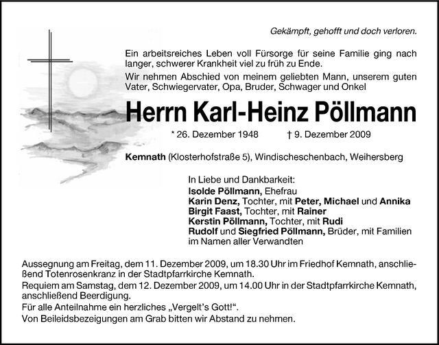 Requiem am Samstag, 12.12.2009 um 14.00 Uhr in der Stadtpfarrkirche Kemnath, anschließend Beerdigung auf dem Friedhof Kemnath.