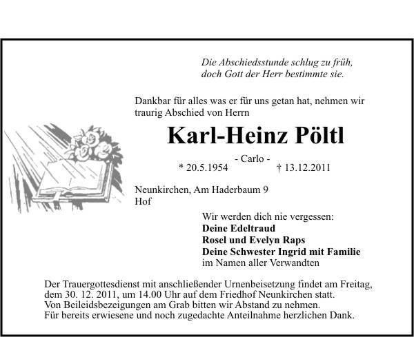 Der Trauergottesdienst mit anschließender Urnenbeisetzung findet am Freitag, dem 30. 12. 2011, um 14.00 Uhr auf dem Friedhof Neunkirchen statt.
