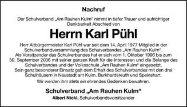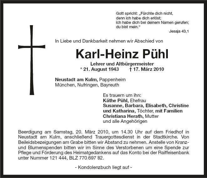 für das plötzliche ableben des lehrers karl heinz pühl möchte ich mein aufrichtiges beileid der familie sagen .schuljahr 1975.