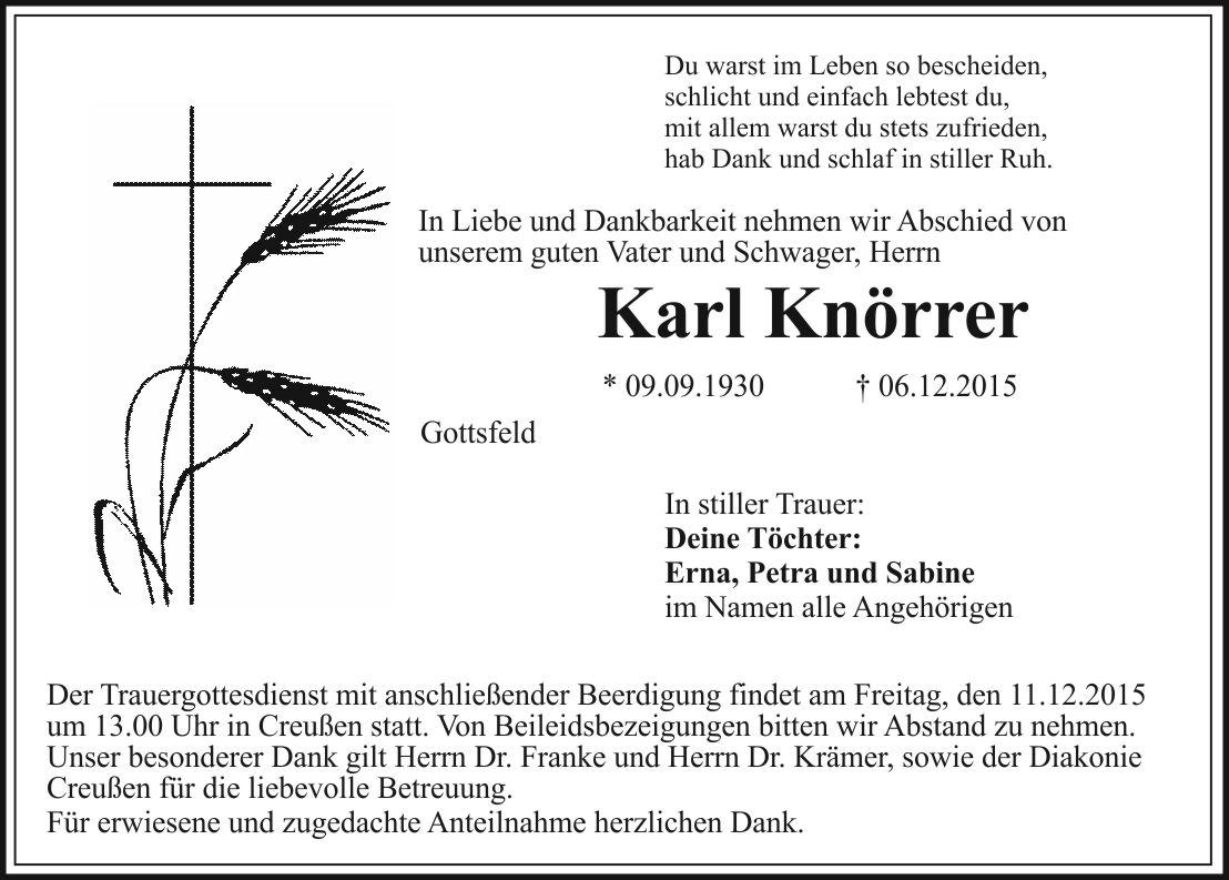 Der Trauergottesdienst mit anschließender Beerdigung findet am Freitag, den 11.12.2015, um 13.00 Uhr in Creußen statt. Von Beileidsbezeigungen bitten wir Abstand zu nehmen. Unser besonderer Dank gilt Herrn Dr. Franke und Herrn Dr. Krämer, sowie der Diakonie Creußen für die liebevolle Betreuung.