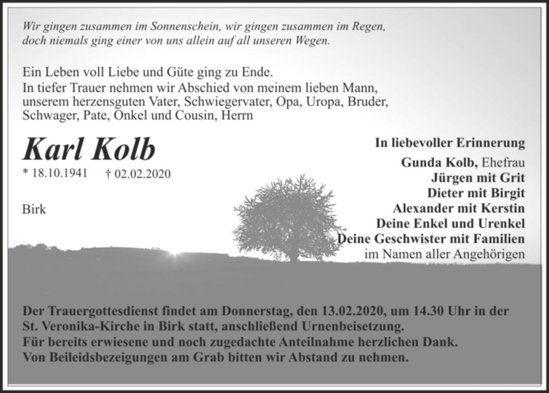 Der Trauergottesdienst findet am Donnerstag, den 13.02.2020, um 14.30 Uhr in der St. Veronika-Kirche in Birk statt, anschließend Urnenbeisetzung. Für bereits erwiesene und noch zugedachte Anteilnahme herzlichen Dank. Von Beileidsbezeigungen am Grab bitten wir Abstand zu nehmen.