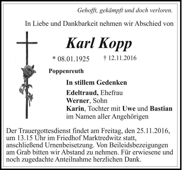 Der Trauergottesdienst findet am Freitag, den 25.11.2016, um 13.15 Uhr im Friedhof Marktredwitz statt, anschließend Urnenbeisetzung. Von Beileidsbezeigungen am Grab bitten wir Abstand zu nehmen. Für erwiesene und noch zugedachte Anteilnahme herzlichen Dank.