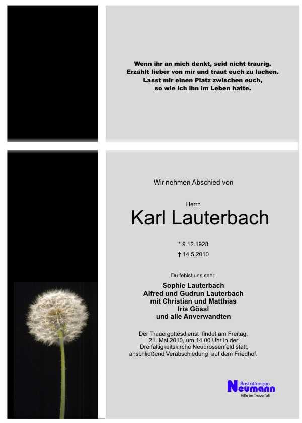 Der Trauergottesdienst findet am Freitag, 21.5.2010 um 14.00 Uhr in der Dreifaltigkeitskirche Neudrossenfeld statt, anschließend Verabschiedung auf dem Friedhof.