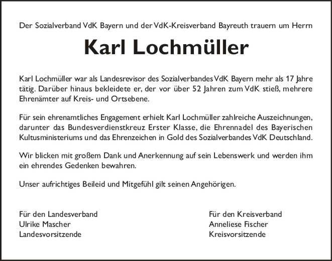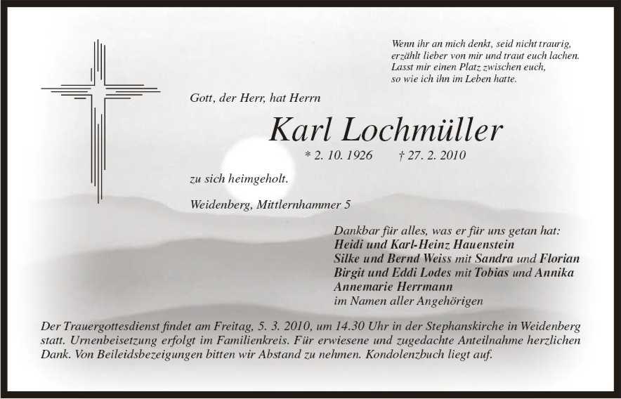 Der Trauergottesdienst findet am Freitag, 5.3.2010 um 14.30 Uhr in der Stephanskirche Weidenberg statt. Urnenbeisetzung in aller Stille.