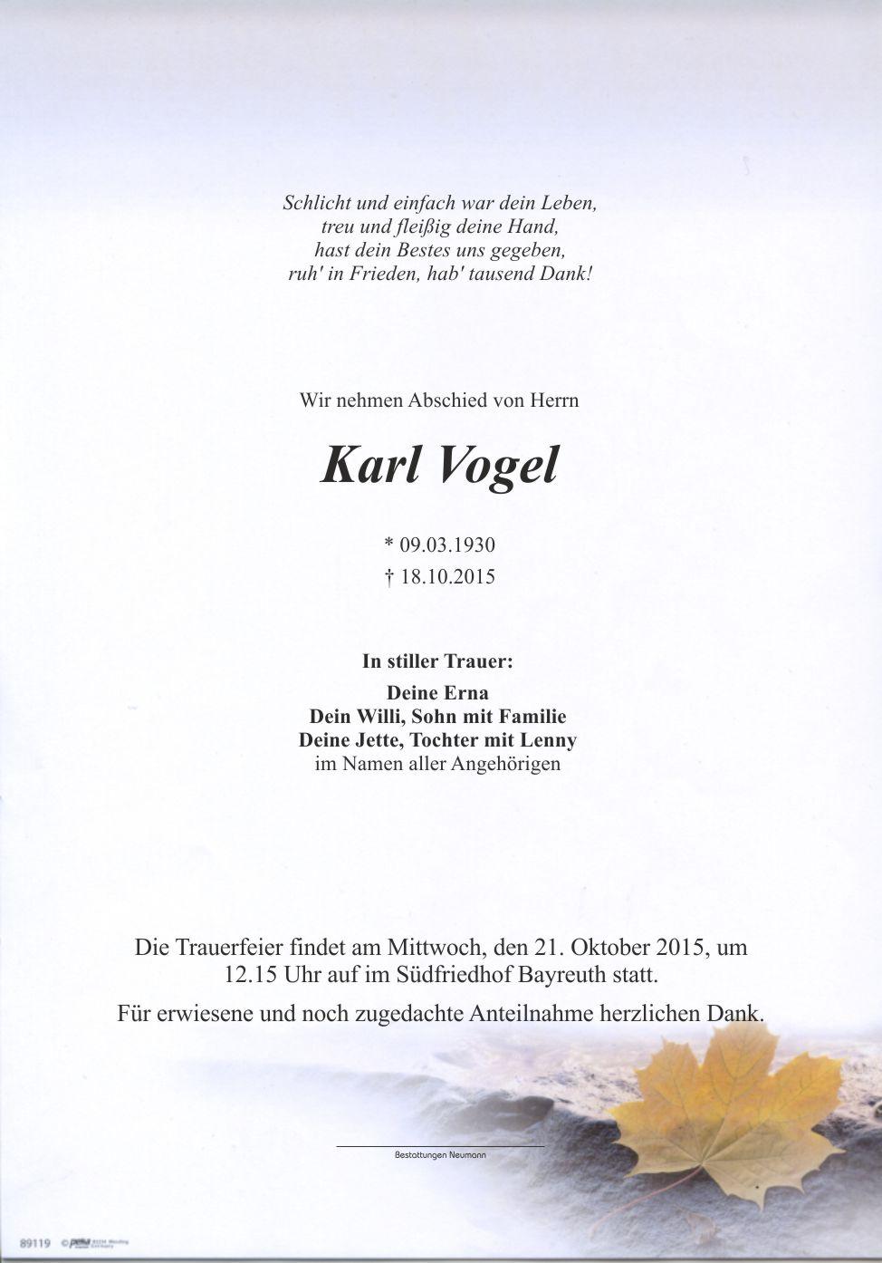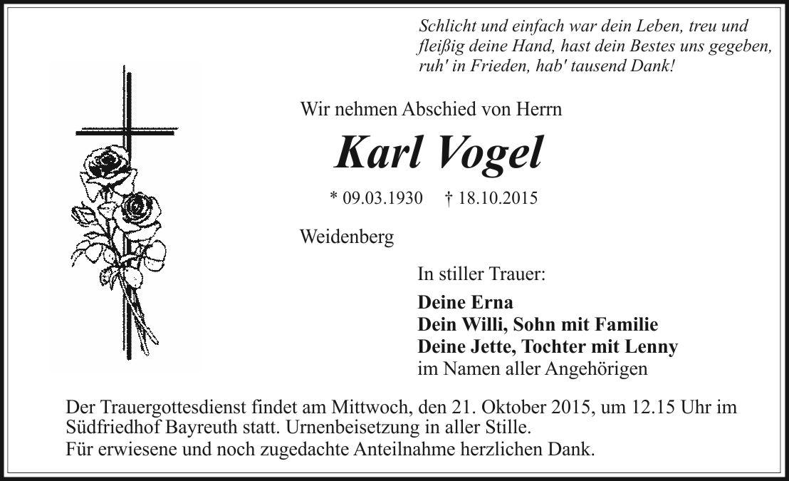 Der Trauergottesdienst findet am Mittwoch, den 21. Oktober 2015, um 12.15 Uhr im Südfriedhof Bayreuth statt. Urnenbeisetzung in aller Stille.