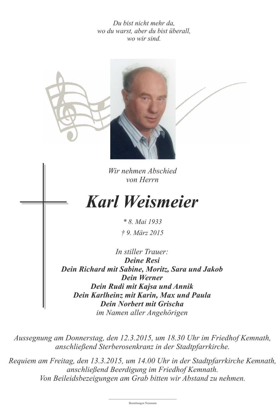 Ich übermittle der Familie Weismeier mein aufrichtiges Beileid. Ich trauere mit meinem Kollegen Karlheinz, den ich persönlich sehr schätze.