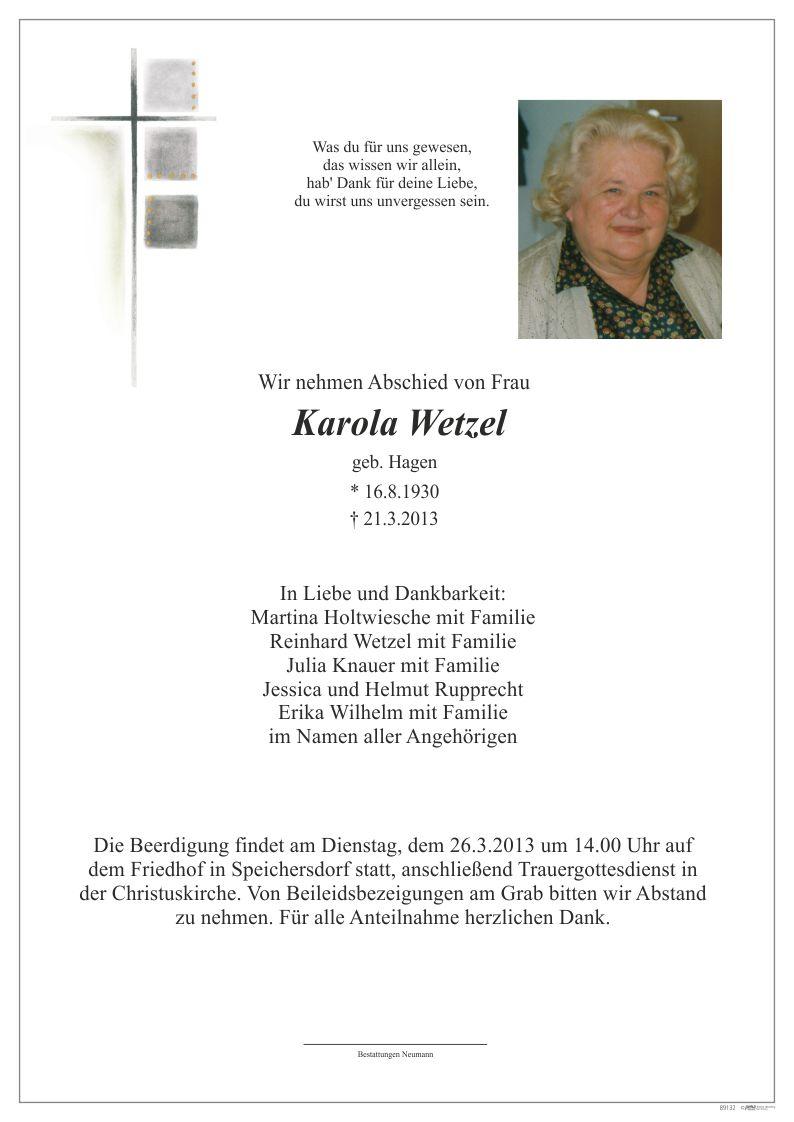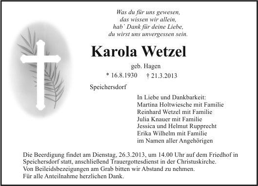 Die Beerdigung findet am Dienstag, 26.3.2013, um 14.00 Uhr auf dem Friedhof in Speichersdorf statt, anschließend Trauergottesdienst in der Christuskirche.