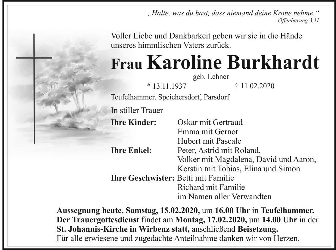 Aussegnung am Samstag, 15.02.2020, um 16.00 Uhr in Teufelhammer.