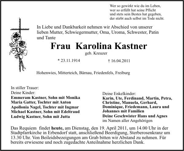 Die Beisetzung findet am Dienstag, 19.04.2011 um 14:00 Uhr auf dem Friedhof in Erbendorf statt.