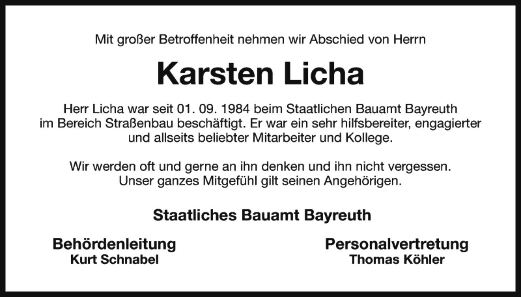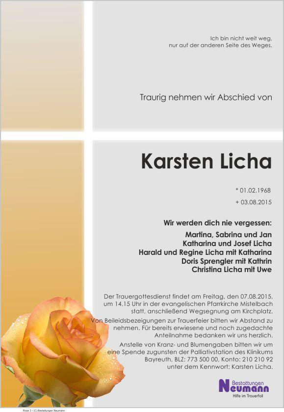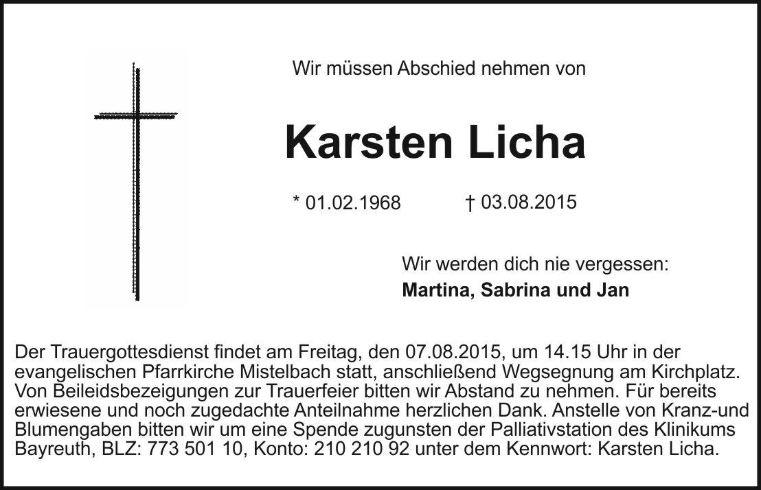 Der Trauergottesdienst findet am Freitag, den 07.08.2015, um 14.15 Uhr in der evangelischen Pfarrkirche Mistelbach statt, anschließend Wegsegnung am Kirchplatz. Von Beileidsbezeigungen zur Trauerfeier bitten wir Abstand zu nehmen. Für bereits erwiesene und noch zugedachte Anteilnahme herzlichen Dank. Anstelle von Kranz-und Blumengaben bitten wir um eine Spende zugunsten der Palliativstation des Klinikums Bayreuth, BLZ: 773 501 10, Konto: 210 210 92 unter dem Kennwort: Karsten Licha.