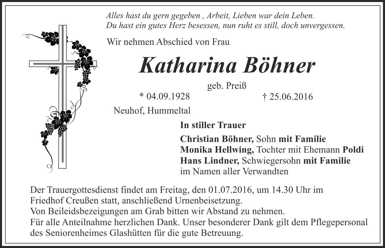 Der Trauergottesdienst mit anschließender Urnenbeisetzung findet am Freitag, den 01.07.2016, um 14.30 Uhr in Creußen statt. Für alle Anteilnahme herzlichen Dank.