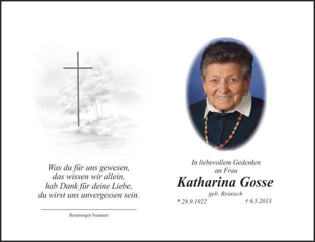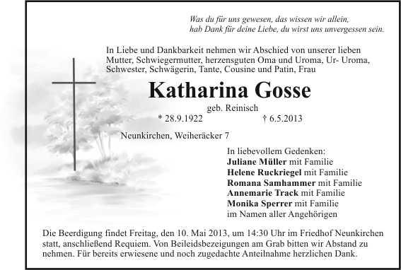 Die Beerdigung findet Freitag, den 10. Mai 2013, um 14:30 Uhr im Friedhof Neunkirchen