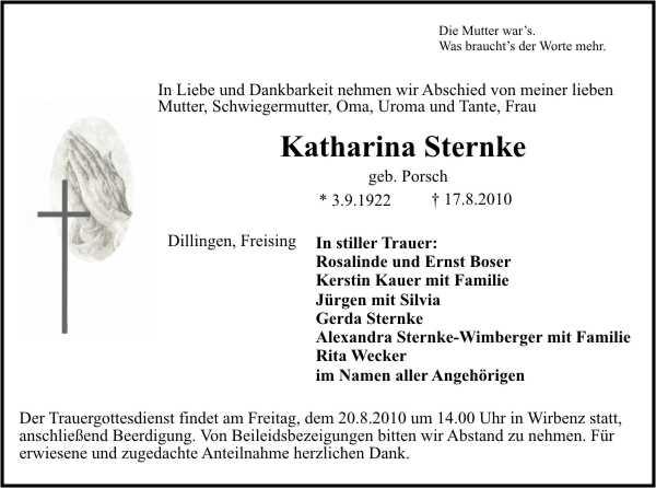 Der Trauergottesdienst findet am Freitag dem 20.8.2010 in der evangelischen Kirche in Wirbenz statt, anschließend Beerdigung.