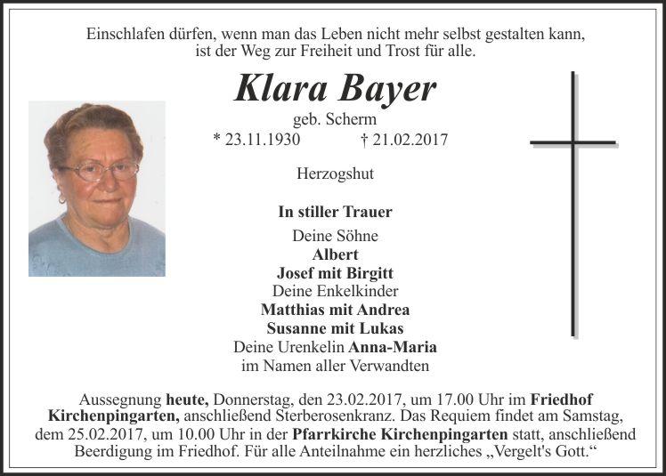 Aussegnung am Donnerstag, dem 23.02.2017, um 17.00 Uhr im Friedhof Kirchenpingarten, anschließend Sterberosenkranz. Requiem am Samstag, den 25.02.2017 um 10.00 Uhr in der Pfarrkirche Kirchenpingarten, anschließend Beerdigung im Friedhof.