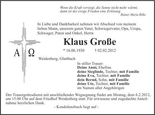 Der Trauergottesdienst mit anschließender Wegsegnung findet am Montag, dem 6.2.2012, um 15.00 Uhr auf dem Friedhof Weidenberg statt. Für erwiesene und zugedachte Anteilnahme herzlichen Dank. - Kondolenzbuch liegt auf -