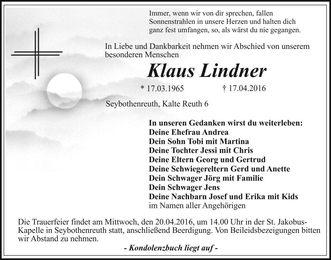 Die Trauerfeier findet am Mittwoch, den 20.04.2016, um 14.00 Uhr in der St. Jakobus-Kapelle in Seybothenreuth statt, anschließend Beerdigung. Von Beileidsbezeigungen bitten wir Abstand zu nehmen.