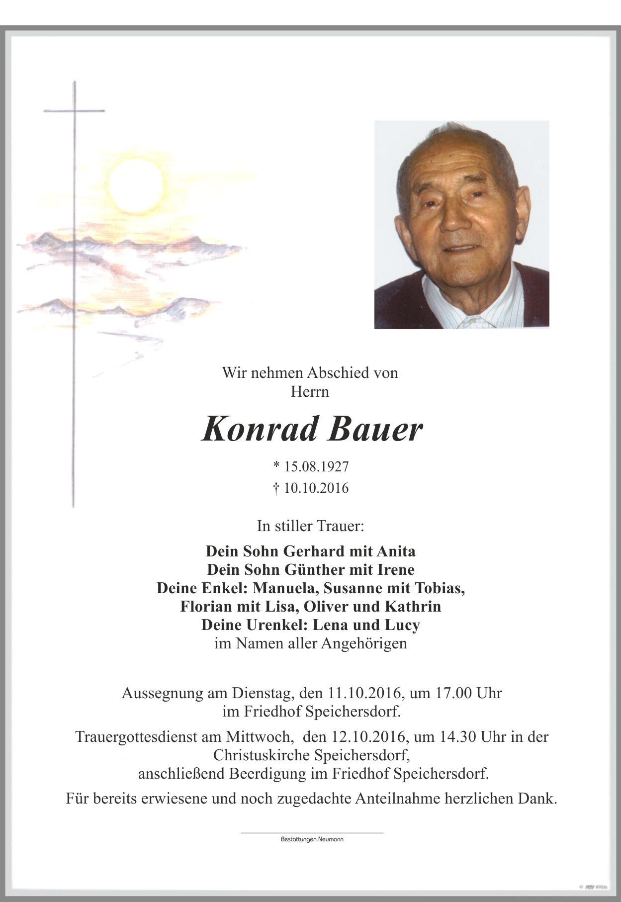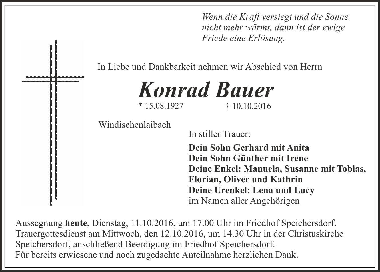 Trauergottesdienst am Mittwoch, den 12.10.2016, um 14.30 Uhr in der Christuskirche Speichersdorf, anschließend Beerdigung im Friedhof Speichersdorf. Für bereits erwiesene und noch zugedachte Anteilnahme herzlichen Dank.