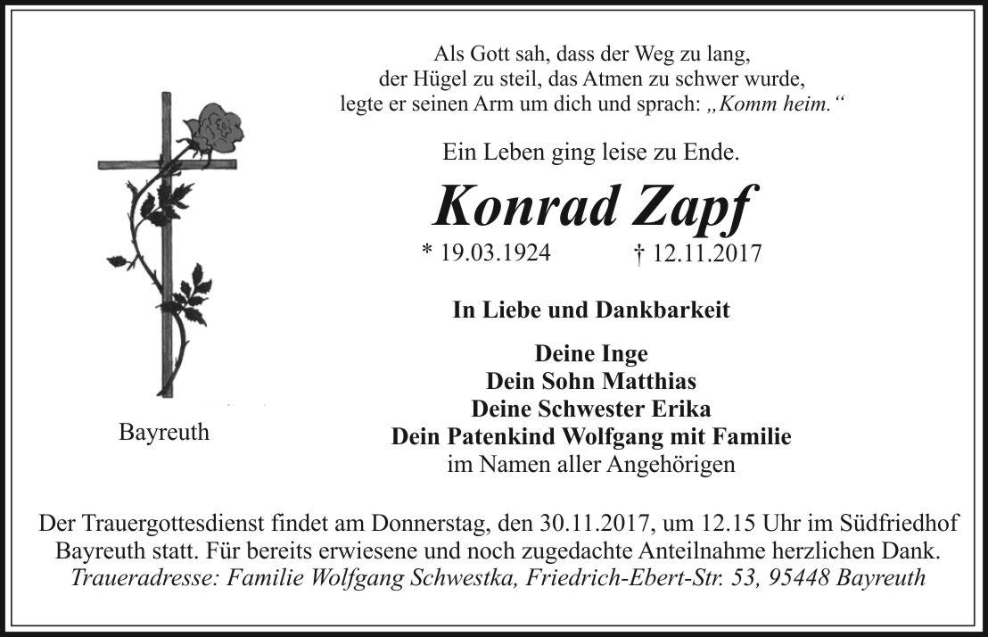Der Trauergottesdienst findet am Donnerstag, den 30.11.2017, um 12.15 Uhr im Südfriedhof Bayreuth statt. Für bereits erwiesene und noch zugedachte Anteilnahme herzlichen Dank