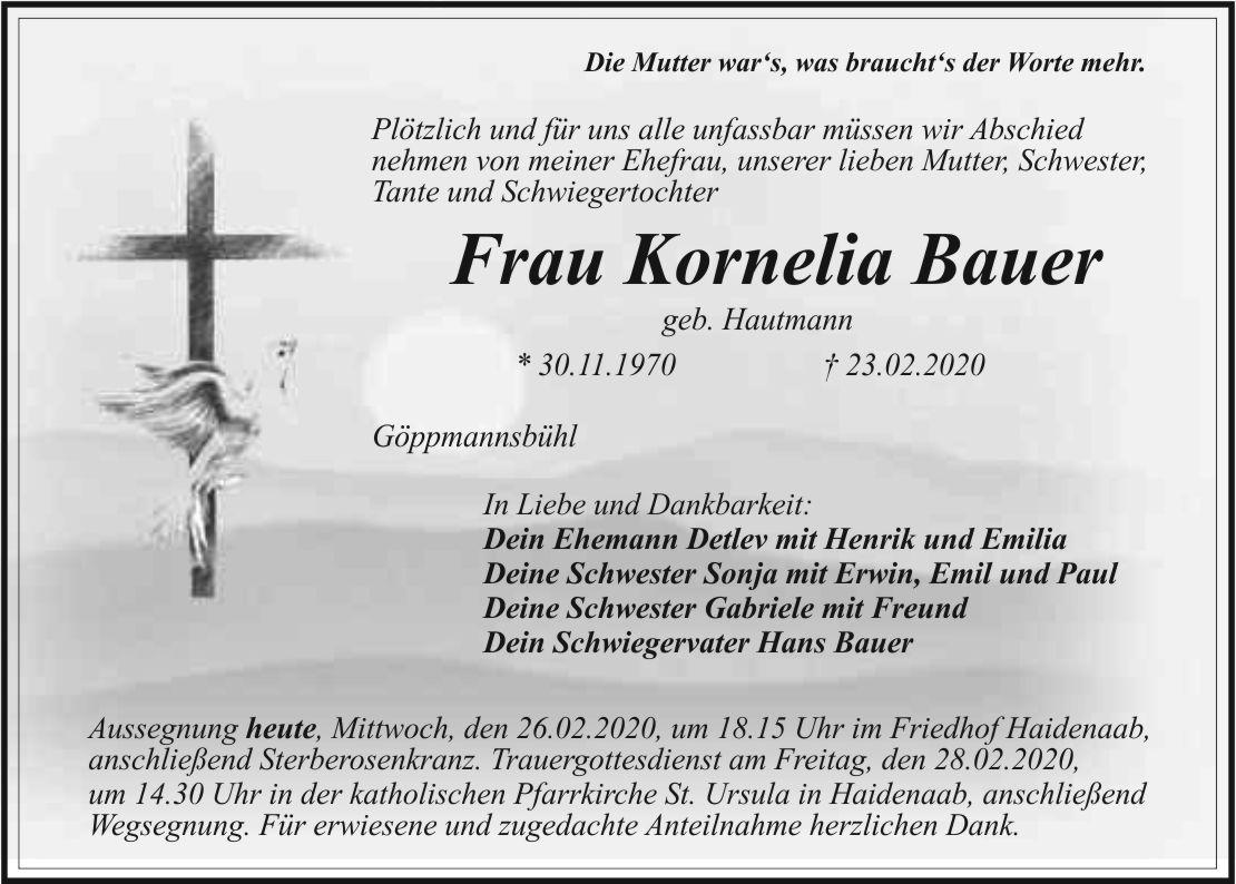 Aussegnung heute, Mittwoch, den 26.02.2020, um 18.15 Uhr im Friedhof Haidenaab, anschließend Sterberosenkranz. Trauergottesdienst am Freitag, den 28.02.2020,