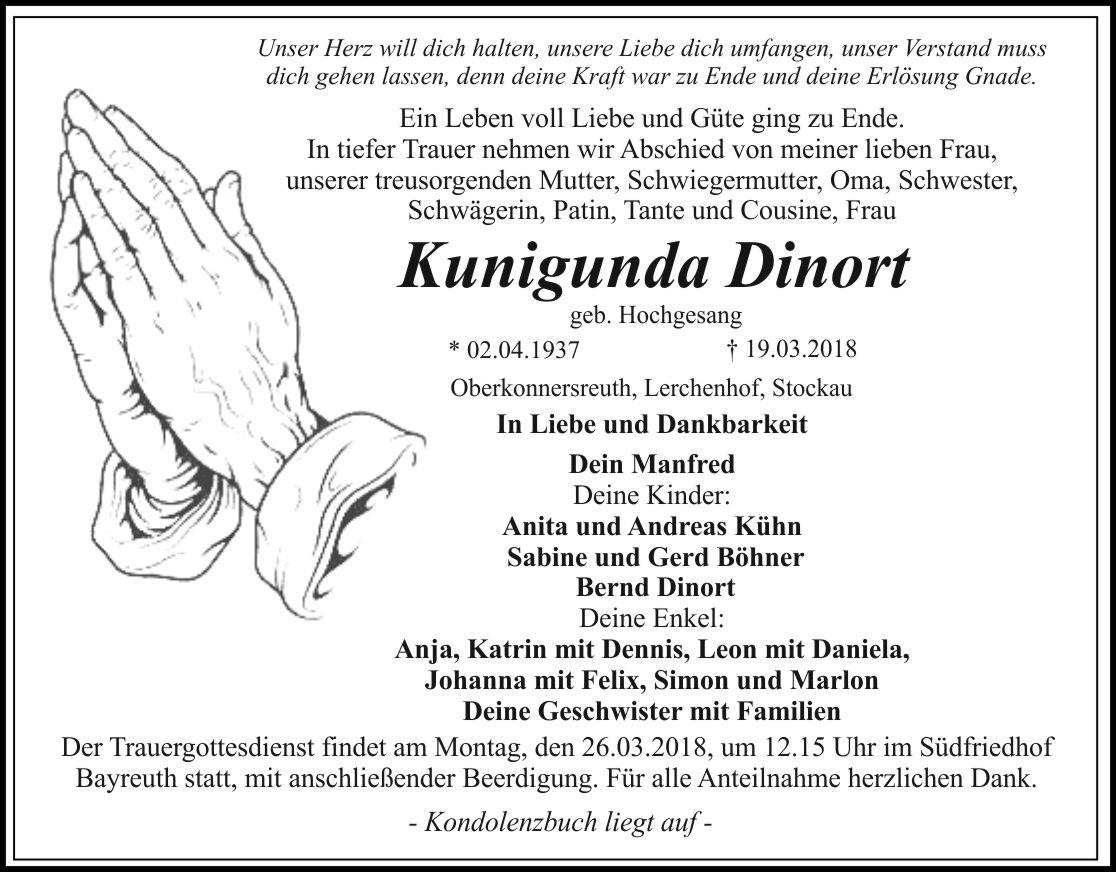 Der Trauergottesdienst findet am Montag, den 26.03.2018, um 12.15 Uhr im Südfriedhof Bayreuth statt, mit anschließender Beerdigung. Für alle Anteilnahme herzlichen Dank. Kondolenzbuch liegt auf.