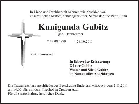 Der Trauergottesdienst mit anschließender Beerdigung findet am Mittwoch, dem 2.11.2011, um 14.00 Uhr auf dem Friedhof in Creußen statt.