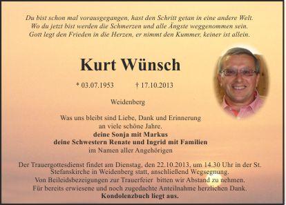 Der Trauergottesdienst findet am Dienstag, den 22.10.2013, um 14.30 Uhr in der St. Stefanskirche in Weidenberg statt, anschließend Wegsegnung.