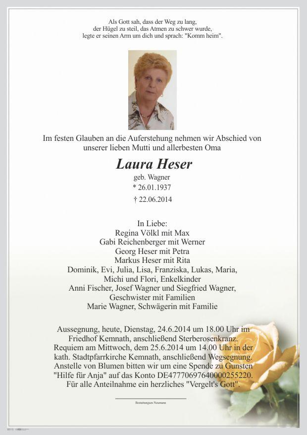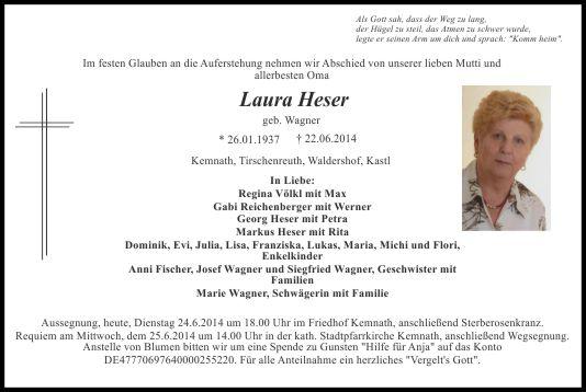 Requiem am Mittwoch, dem 25.6.2014 um 14.00 Uhr in der kath. Stadtpfarrkirche Kemnath, anschließend Wegsegnung. Anstelle von Blumen bitten wir um eine Spende zu Gunsten "Hilfe für Anja" auf das Konto