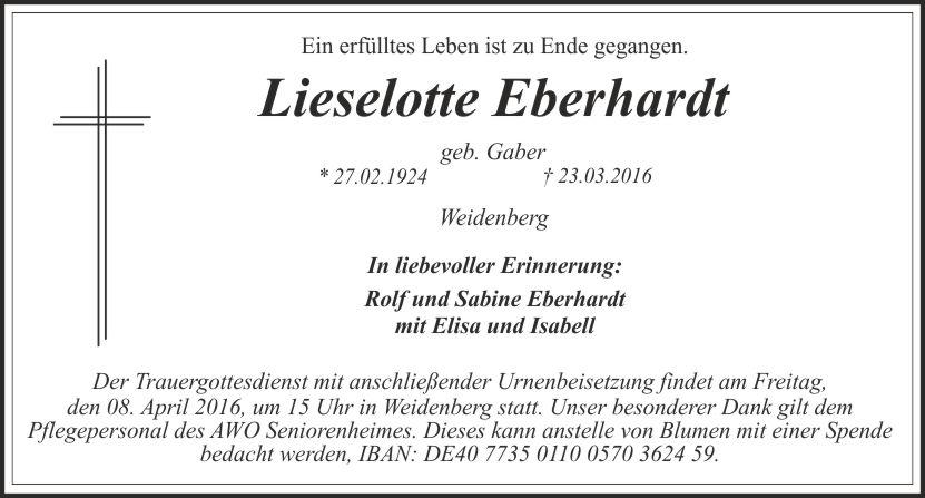 den 08. April 2016, um 15 Uhr in Weidenberg statt. Unser besonderer Dank gilt dem Pflegepersonal des AWO Seniorenheimes. Dieses kann anstelle von Blumen mit einer Spende bedacht werden, IBAN: DE40 7735 0110 0570 3624 59.