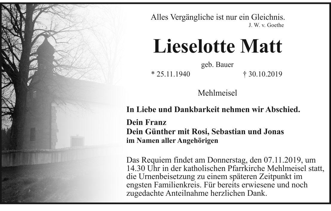 Das Requiem findet am Donnerstag, den 07.11.2019, um 14.30 Uhr in der katholischen Pfarrkirche Mehlmeisel statt, die Urnenbeisetzung zu einem späteren Zeitpunkt im engsten Familienkreis. Für bereits erwiesene und noch zugedachte Anteilnahme herzlichen Dank.